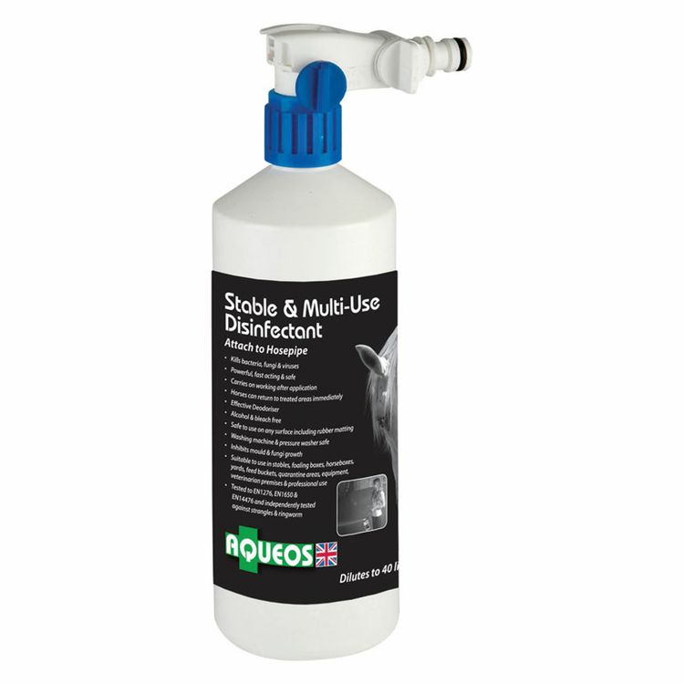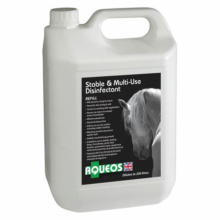 Aqueos Stable & Multi-Use Disinfectant kills bacteria, fungi & viruses in seconds. Carries on working after application. Horses can return to treated areas immediately. Aqueos is very powerful, has the same chemical hazard rating as water and is alcohol and bleach free. Safe to use on any surface including rubber matting. Washing machine & pressure washer safe. Inhibits mould & fungi growth. Suitable to use in stables, foaling boxes, horseboxes, yards, feed buckets, quarantine areas, equipment, veterinarian premises & professional use.