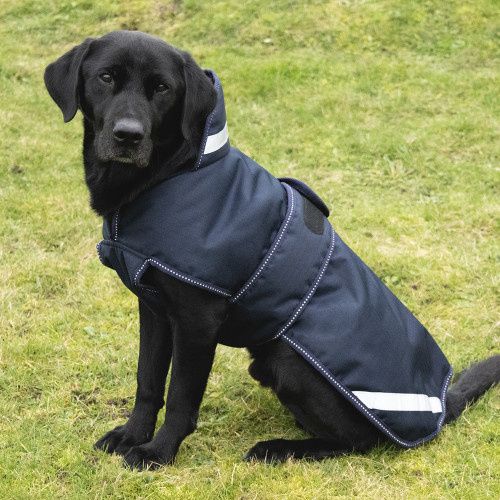 This practical and stylish dog coat is a made from a 600 denier outer and features a warm 100g fill to keep your dog toasty. With a reflective silver top half and collar to create optimum visibility whilst out walking your dog - perfect for the winter months and finished with a smart navy bottom half and strap. The coat is secured safely in place with adjustable back leg closers and touch tape fastenings. With additional collar to offer your dog even more protection, this dog coat also features lead hole for practicality and leather binding for a stylish look. Finished with Benji & Flo leather look logo and tonal stitching.