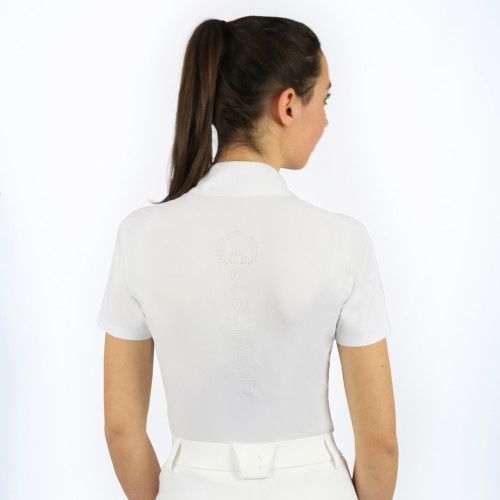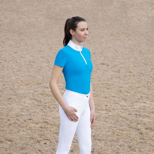 A must have addition for any serious equestrian athlete, the Ayton Show Shirt is endlessly practical and a wonderful looking competition shirt. The exceptionally buttery-soft short sleeved competition shirt sculpts perfectly for a feminine fit and is crafted from a revo-tech and antibacterial fabric that optimises moisture and sweat wicking with help from capillary action to help keep the active rider fresh and hygienic. The free stretch material that is specially crafted using a seamless design for ultimate comfort, allows for a full and comfortable range of movement. The easy-care anti-UV fabric can be machine washed at 30 degrees and dries quickly, making the shirt ideal for frequent wear. A perforated logo features on the back of the shirt, that not only gives an elegant finish, but performance is enhanced due to the additional airflow and ventilation aiding breathability. The shirt is fastened with a silver zip and hexagonal zip pull, detailed with a Coldstream blue lining. Finished with Luxury Coldstream branding including silicone logo to the sleeve and emblem to the collar.