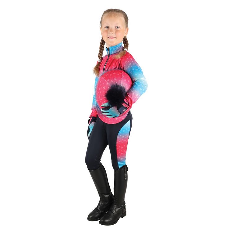 Create a stand our style with the Dazzling Diamond Base Layer! This stunning base layer is made from a ombre pink and teal diamond patterned fabric. The four way stretch material for a flexible and comfortable fit all day long. Featuring a silver half zip with navy detailing for ease of dressing and matching classy navy stitching throughout. The Little Rider logo is embroidered on the chest. Matches perfectly with the Dazzling Diamond collection for a beautiful matchy matchy look!