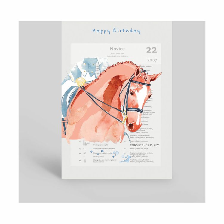 Hand-painted greetings card, featuring an original competition horse in watercolour with test sheet and positive message for the recipient. Card reads: Happy Birthday. Consistency Is Key. The collection is designed for anyone competing, or working towards; Eventing, Dressage, Jumping, or simply working in, schooling and arena flat work. Suitable for any age, any gender. BLANK INSIDE. Made in UK. Cello wrapped with Blue envelope.