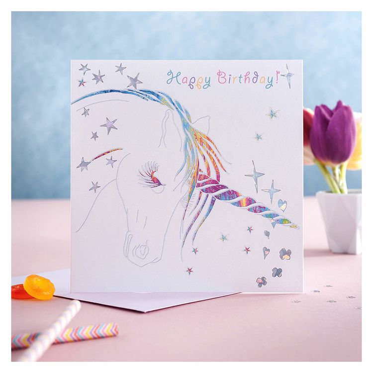 This super pretty unicorn birthday card is sprinkled with sparkling stardust and magic – perfect for little horse and unicorn lovers. The unique hand-illustrated pink greetings card features a brightly prancing unicorn with sparkly rainbow metallic foiled stars/hearts/flowers on the front, which also appear on the rear of the card. Blank inside for your own message. Individually cello wrapped.