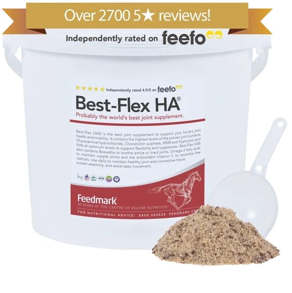 Best-Flex HA® is probably the best horse joint supplement ever formulated to support your horse’s joint health and mobility. It contains the highest levels of the proven joint nutrients Glucosamine hydrochloride, Chondroitin sulphate, MSM and Hyaluronic acid (HA) at optimum levels to support flexibility and suppleness. Best-Flex HA® also contains Boswellia to help soothe active or tired horse joints, Omega-3 fatty acids to maintain supple horse joints and the antioxidant Vitamin C that helps to neutralise free radicals. Use daily to help maintain healthy horse joints and connective tissue. Continue long term daily use throughout your horse’s active career to provide fundamental joint nutrients to maintain flexibility and elasticity, and for your veteran or retired horse to soothe the joints and help support easy movement.The Best-Flex HA®daily feeding rate (500kg horse) contains: 18000mg Glucosamine, 6500mg Chondroitin, 18000mg MSM, 1100mg Hyaluronic acid, 11000mg Vitamin C, 11000mg Omega-3 & 12000mg Boswellia.