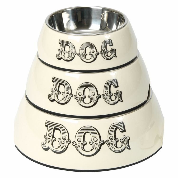 The set includes a cream bowl with DOG print pattern made in thick melamine and a removable stainless steel bowl. The melamine bowl also features anti slip rubber feet. The set can be used separately or as one.