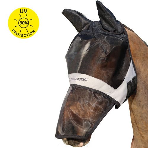 This Hy Equestrian Black Armoured Protect Full Mask with Ears and Nose, offers the ultimate protection from those annoying flying insects, covering the ears, eyes, face and nose.