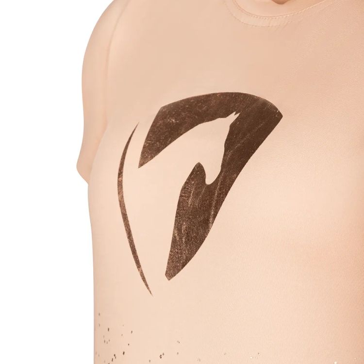 The perfect summer t-shirt! Designed using a moisture wicking, easy-care fabric for optimal breathability and airflow, making this ideal for the active rider for days at the yard or to wear casually with a pair of jeans. Specially shaped for a flattering fit, making you feel confident and comfortable all day long. With rose gold metallic mottled effect on the bottom half of the t-shirt and coordinating shield emblem on the chest.