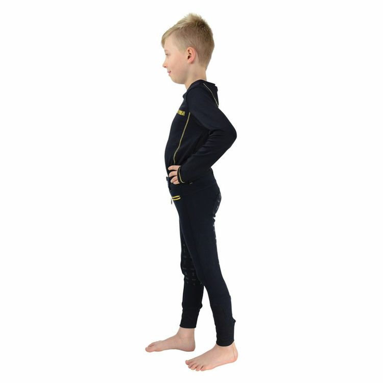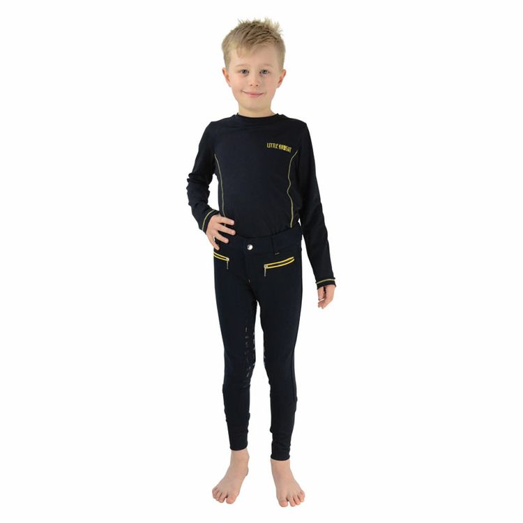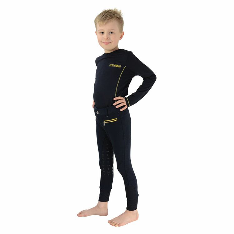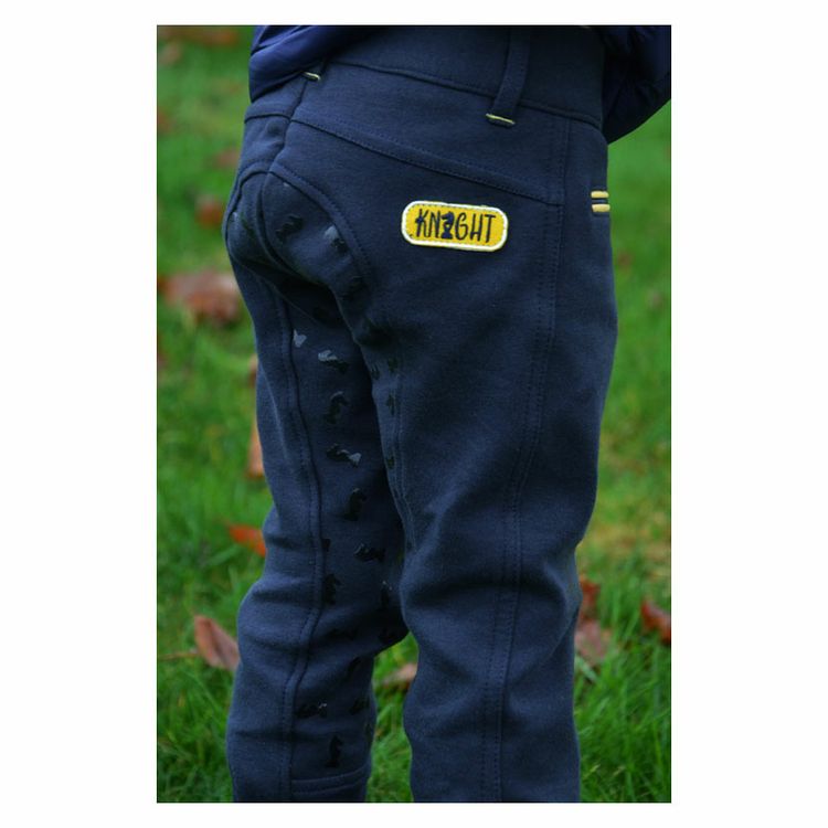 These smart navy blue breeches with contrasting yellow top-stitching and Little Knight emblem on the back are made from stretch cotton and match the rest of the Little Knight range for a coordinated look. They have two zipped pockets at the front, a full silicone seat in the Little Knight logo to aid grip in the saddle and no-bulk ankles for comfort inside long boots.