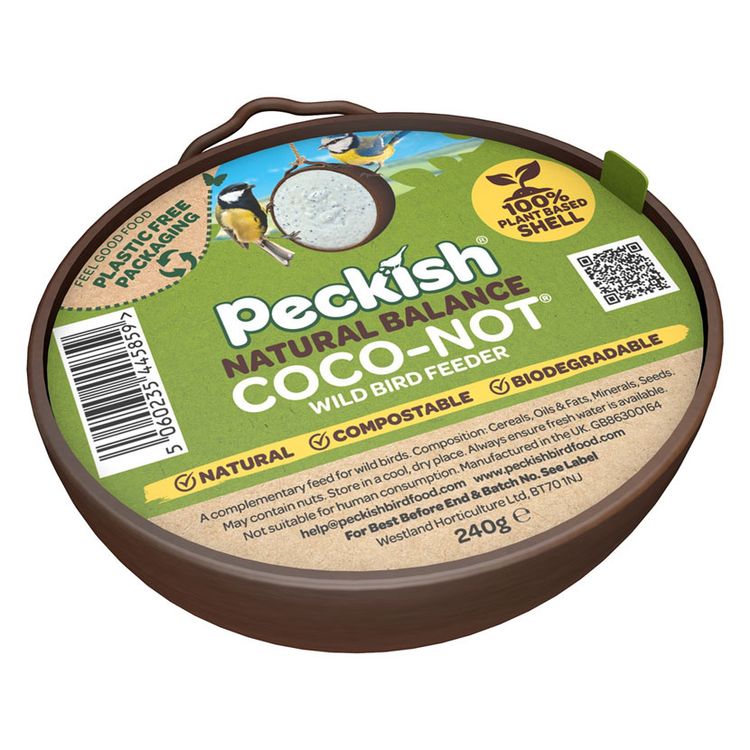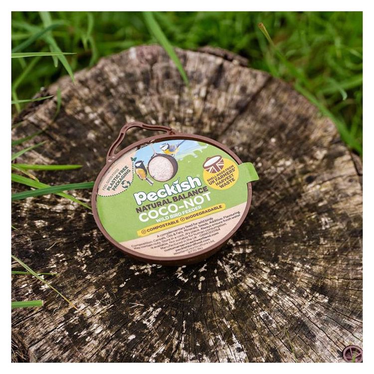 These new, patent pending Peckish Coco-Not® Wild Bird Feeders are ready-to-hang suets made of a revolutionary, biodegradable material. Coco-Not® feeders, better for nature, not shipped across the world like coconut shells and still not using plastic! 100% plant based shell not there after 12 weeks! 100% compostable.