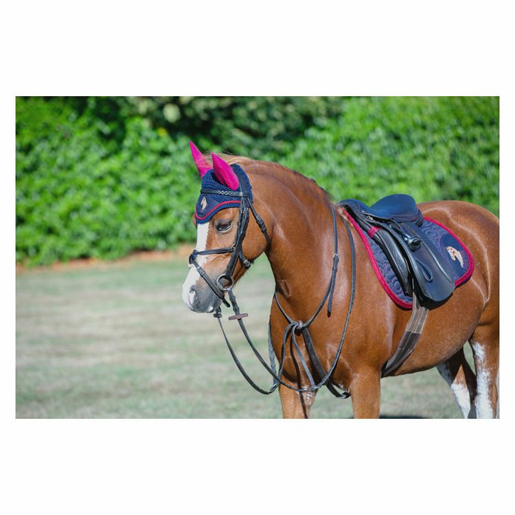 Keep your horse or pony protected from the flies with the Riding Star Fly Veil. Made from a close knit crochet, this fly veil promotes maximum airflow to keep your horse cool and comfortable. The ears are made from a breathable, noise dulling fabric to combat any potential sound pollution. Featuring burgundy glitter binding and textured applique Riding Star horse on the half star shaped front. Matches the rest of the collection perfectly.