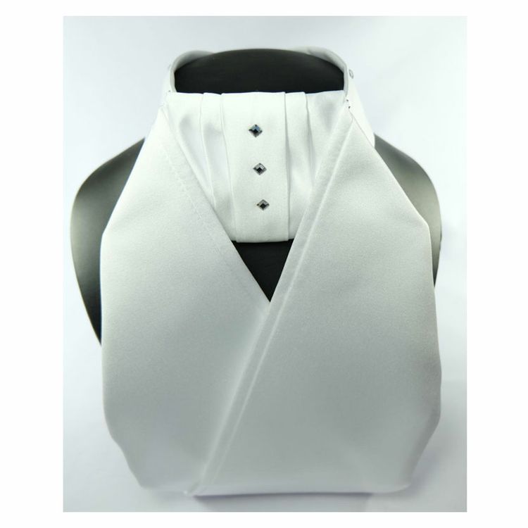 A ready tied stock made from 100% polyester satin. Non pill. Designed with three diamond shaped crystals on the centre neck piece. Designed with a hook and loop fastening to allow plenty of adjustment and includes a buttonhole to attach to a shirt.