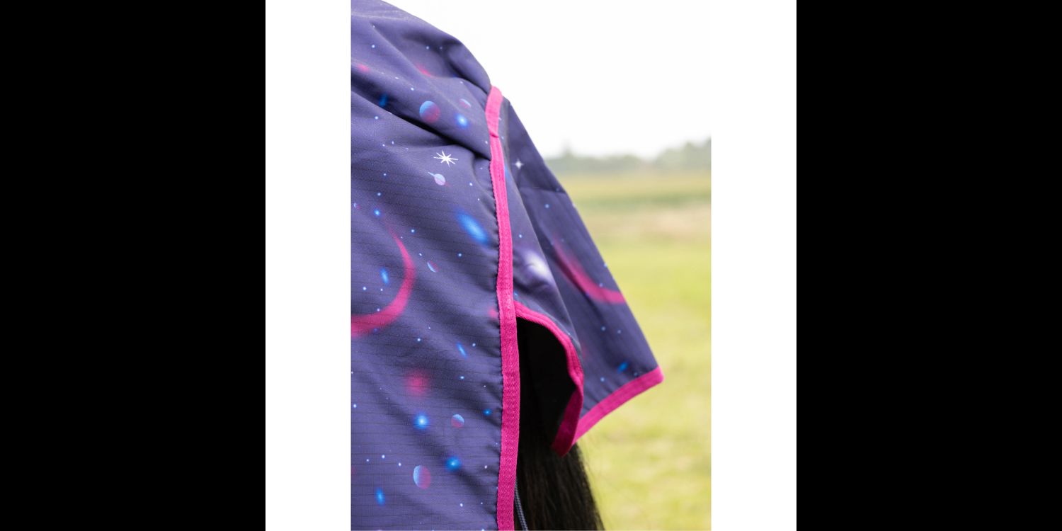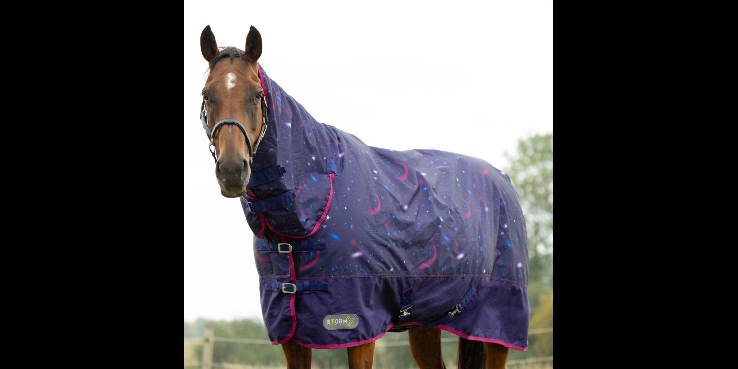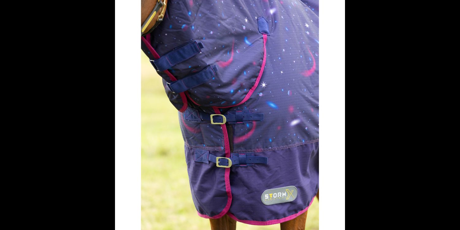 Give your horse the ultimate cosmic comfort with the StormX Original Out of this World 200 Combi Turnout Rug. Designed with a striking space-inspired print, this medium-weight rug offers both style and substance, perfect for colder, wetter days when extra protection is needed.The 600 denier ripstop outer is waterproof and breathable, shielding your horse from the elements while preventing overheating. With a 200g fill, this rug provides a cosy layer of warmth, ideal for the autumn and winter months. The integrated neck cover offers additional coverage, helping to keep your horse warm and dry from ears to tail. Practical features like secure twin buckle chest fastenings, adjustable cross surcingles, leg straps, and a generous tail flap ensure a close, comfortable fit. Why not match with the rider wear and head collar?