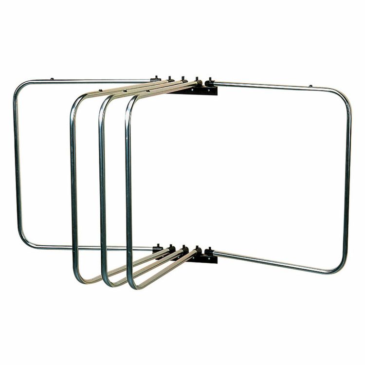 5 swivelling arms mounted on 2 Stubbyfine coated wall brackets. Configured to allow adjoining units, thus creating a continuous display. A small knob on the upper side of each arm deters rugs from sliding off as selection takes place. Height 93cm, Width 35cm, Projection 80cm, Weight 11.7kg.