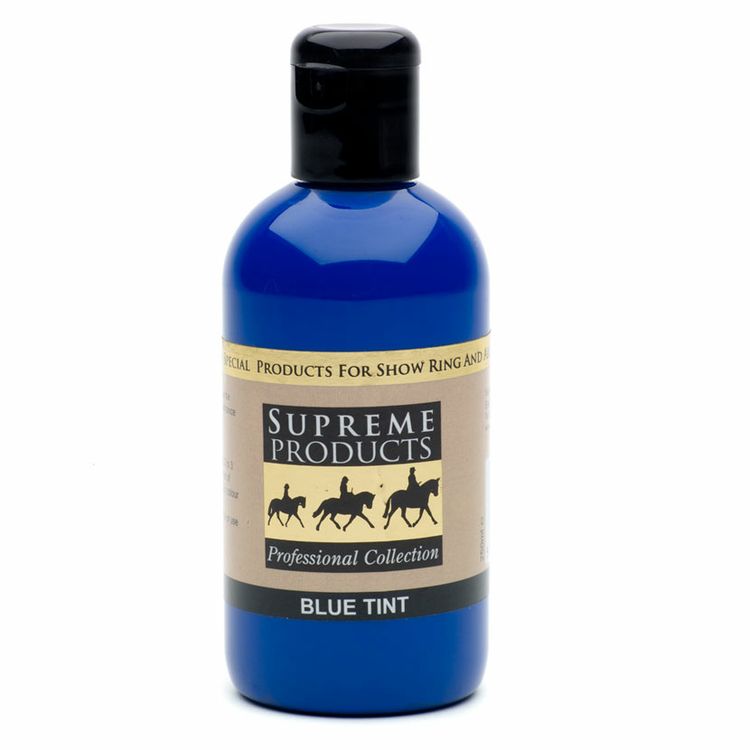 In a quick & easy dispenser, Supreme Products Blue Tint is a liquid which makes colour enhancing easy. Just add a few drops to warm rinsing water, test for colour strength on a few animal hairs before use and apply to body, legs or tail as required. Great on all colour coats & fabulous for coloureds! Use it sparingly - only 2 or 3 drops needed for a large bucket.