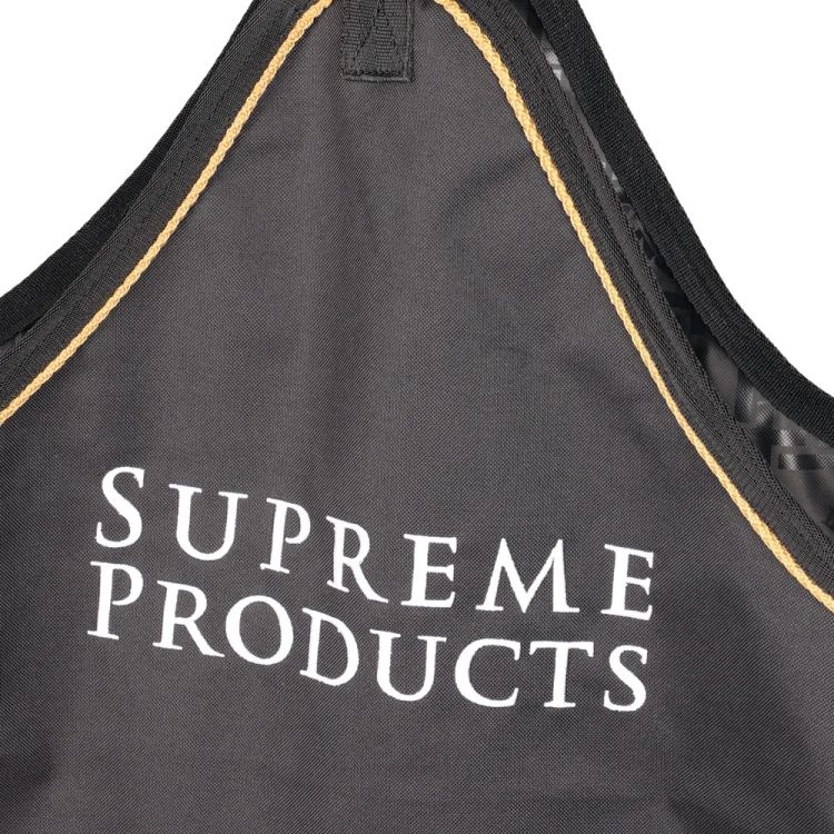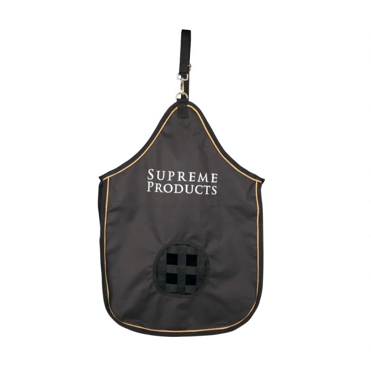 A durable, convenient, and easy-to-use hay bag that is ideal for using at home, at competitions, and while travelling. Designed to reduce waste, it is easy to fill and will keep mess to a minimum. Featuring an adjustable strap and clip fastening for quick and easy hanging and a small windowed front to keep your horse occupied for longer. Finished in signature black and gold colours to match the rest of the Supreme Products luggage collection.