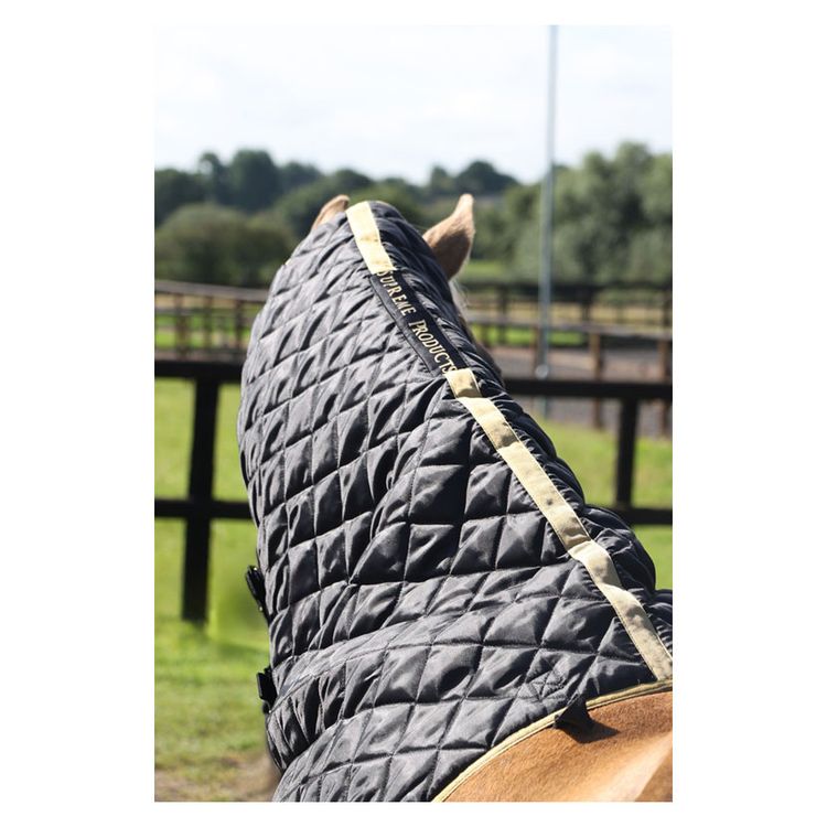 This super easy to pop on and off 100g quilted hood, thanks to the touch tape fastenings, is a winter essential your horses’ wardrobe needs. Perfect to use when waiting for classes in the collecting ring or at home in the colder months over a Lycra Hood. As with all Supreme Products garments this hood features large eye and ear holes to ensure a comfortable fit, with the addition of straps to attach to a roller. Finished in signature black and gold Supreme branding.