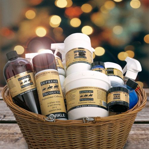 Ultimate Gift Basket includes 400ml Sparkle, 750ml De luxe Coat Gloss, 500ml Spray and Shine, 500ml Easy Plait, 250ml Glistening Oil, 236ml Hoof Paint (Clear or Black), 30g Blue Rinse, 500ml High Shine Shampoo, 500ml Blue Shampoo, 500ml Moisture and Condition, 400ml Cover Magic (Black, White or Brown), 1kg Leg and Body Whitener, 50g Black Eye Gloss, High Shine Wipes, 250ml Quarter Marking Spray and 200g Highlighter Gel.