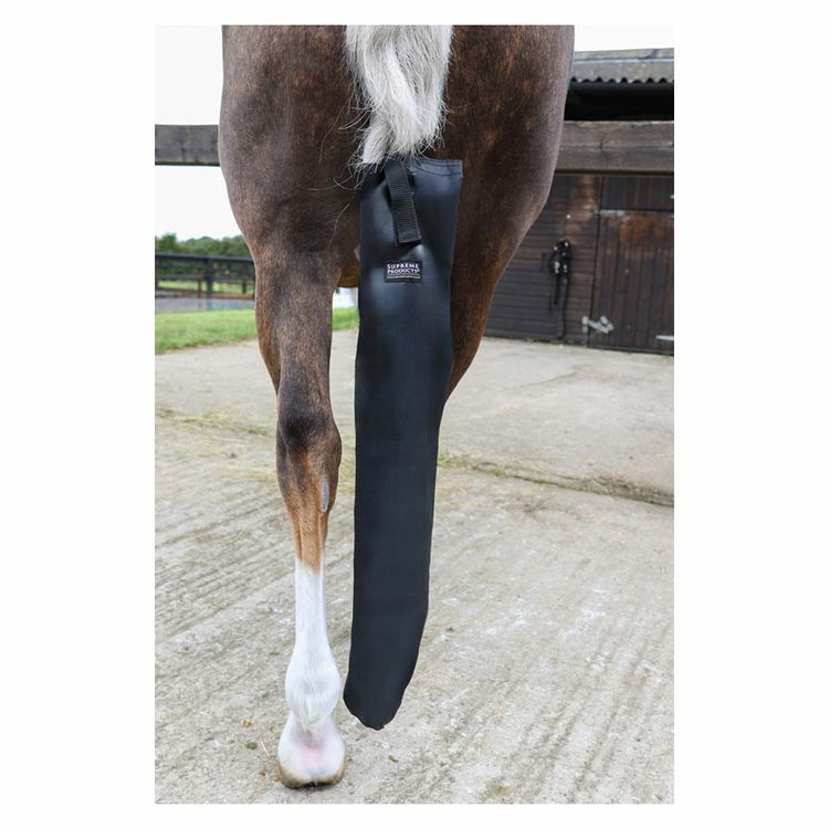 The Supreme Products Waterproof Tail Bag is an equine wardrobe essential, helping keep your horse’s tail clean and pristine. A show day and travel must have, the waterproof tail bag is also great to use in the stable and field all year round to maintain the condition of the hair and help prevent discolouring of white tails. Designed with practicality in mind, the waterproof tail bag allows the addition of a bandage/tail guard if required, has an elasticated pull top to keep the bag securely in place while also acting as a barrier, preventing mud, bedding and anything else that can dirty the tail out! The bag features a loop for threading a plaited tail through for those looking for extra security, full length opening for ease of applying to a thick tail, and a touch tape fastening option on the bottom of the bag allowing you to fold the tail bag in half.