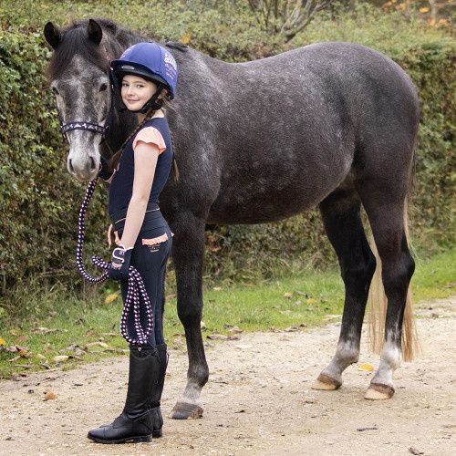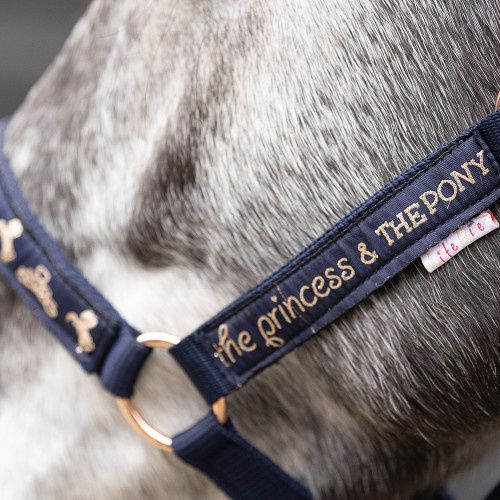 This gorgeous navy head collar features the Princess and the Pony design on the nose and cheek pieces. Featuring adjustable head piece, tonal stitching and silver hardware. Comes with a two tone matching lead rope. Match with the rest of the collection!