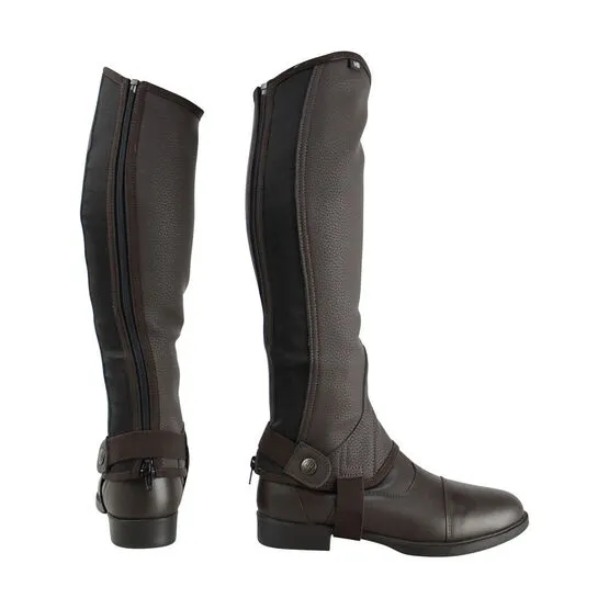 The HyLAND Synthetic Combi Brown Leather Chaps feature an elasticated panel for a snug fit, as well as an additional panel at the front to easily slide over your jodhpur boots.
