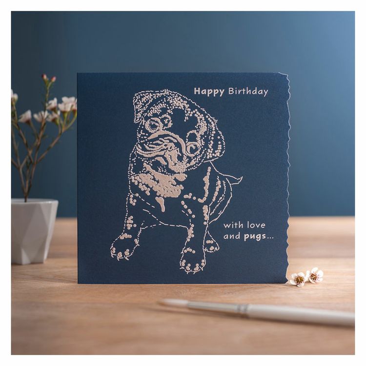 Card: 150x150mm sq, Blank inside. Envelope: 155mm sq, white textured. Individually cello wrapped Front: Happy Birthday ...with hogs and kisses. Finish: Die-cut deckle to the edge. Made in the UK. Featuring an original design of an adorable prickly hedgehog, enhanced with solid bold green teal colour on a natural fleck background with a unique die-cut edging