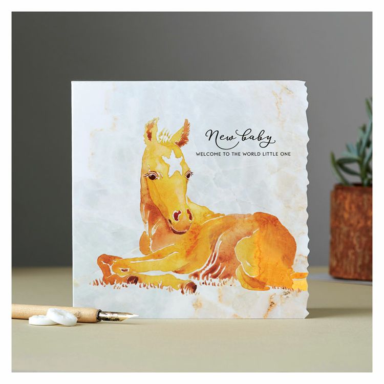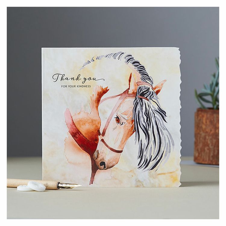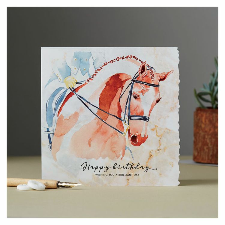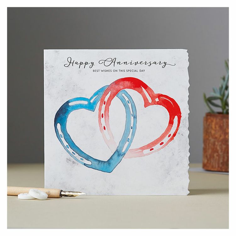 Card: 150x150mm sq, Blank inside. Envelope: 155mm sq, grey. Individually cello wrapped. Made in the UK. Front: Happy Anniversary. Best wishes on this special day. Finish: Outer gloss varnish, Die-cut to the edge. Featuring an original hand-painted watercolour design of two horse shoes entwined as hearts, enhanced with a marble background with a unique die-cut edging.