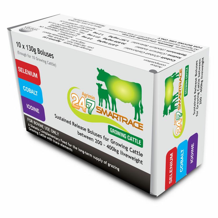 A sustained release bolus containing iodine, selenium and cobalt. Intended for growing cattle on grass or forage based diets 200-400kg for efficient growth, optimum health and fertility but where additional copper is not required. One bolus administration lasting 180 days.