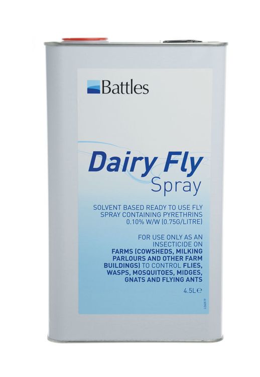 Battles Dairy Fly Spray is a ready-to-use fly spray containing natural pyrethrins for a fast knockdown of all flies and insects. Treats cow sheds milking parlours pig and poultry housing manure heaps and slurry pits.