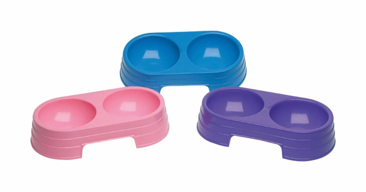 Two compartment feed and/or water bowl made from easy to clean plastic.