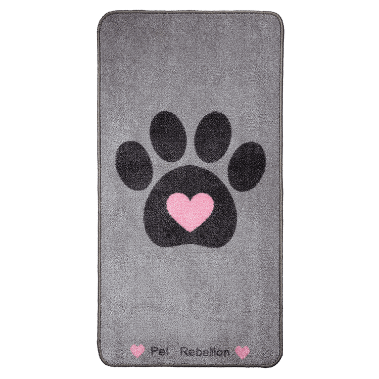 Protect your floors and keep them clean with the Pet Rebellion Big Paws XL Pink Heart Print Dog Mat. Designed with large dogs or multiple dogs in mind, this mat features a super absorbent pile that catches most of the mud and dirt your dogs bring in. With a beautiful pink heart print, it's not only practical but stylish too. The mat has a non-slip backing and rounded corners to keep it firmly in place, and it's completely machine washable to prevent bacterial build-up and bad odours.