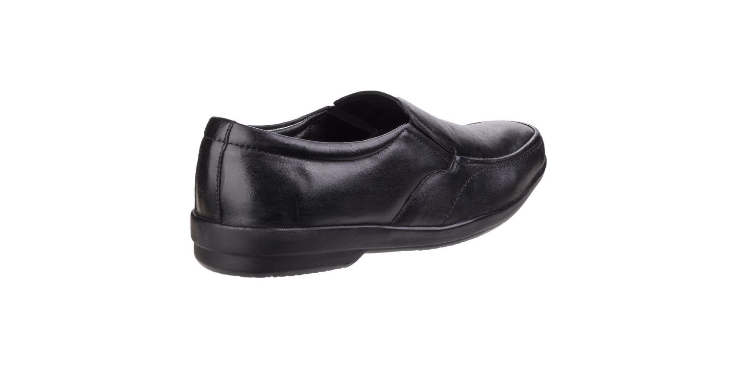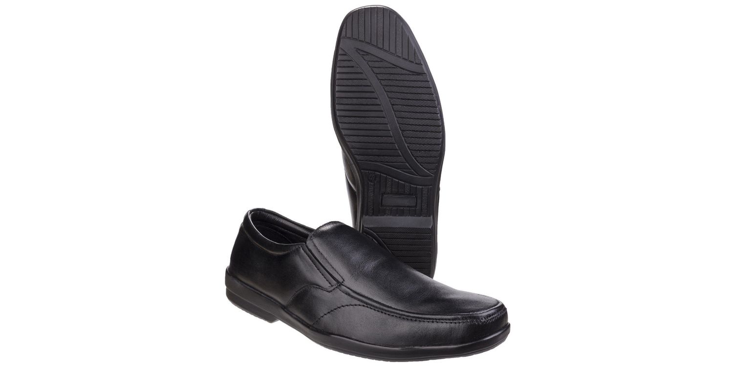 This men's formal twin gusset slip-on shoe has an apron toe finish, fully cushioned foot bed and lightweight PU sole, with a smooth leather upper.