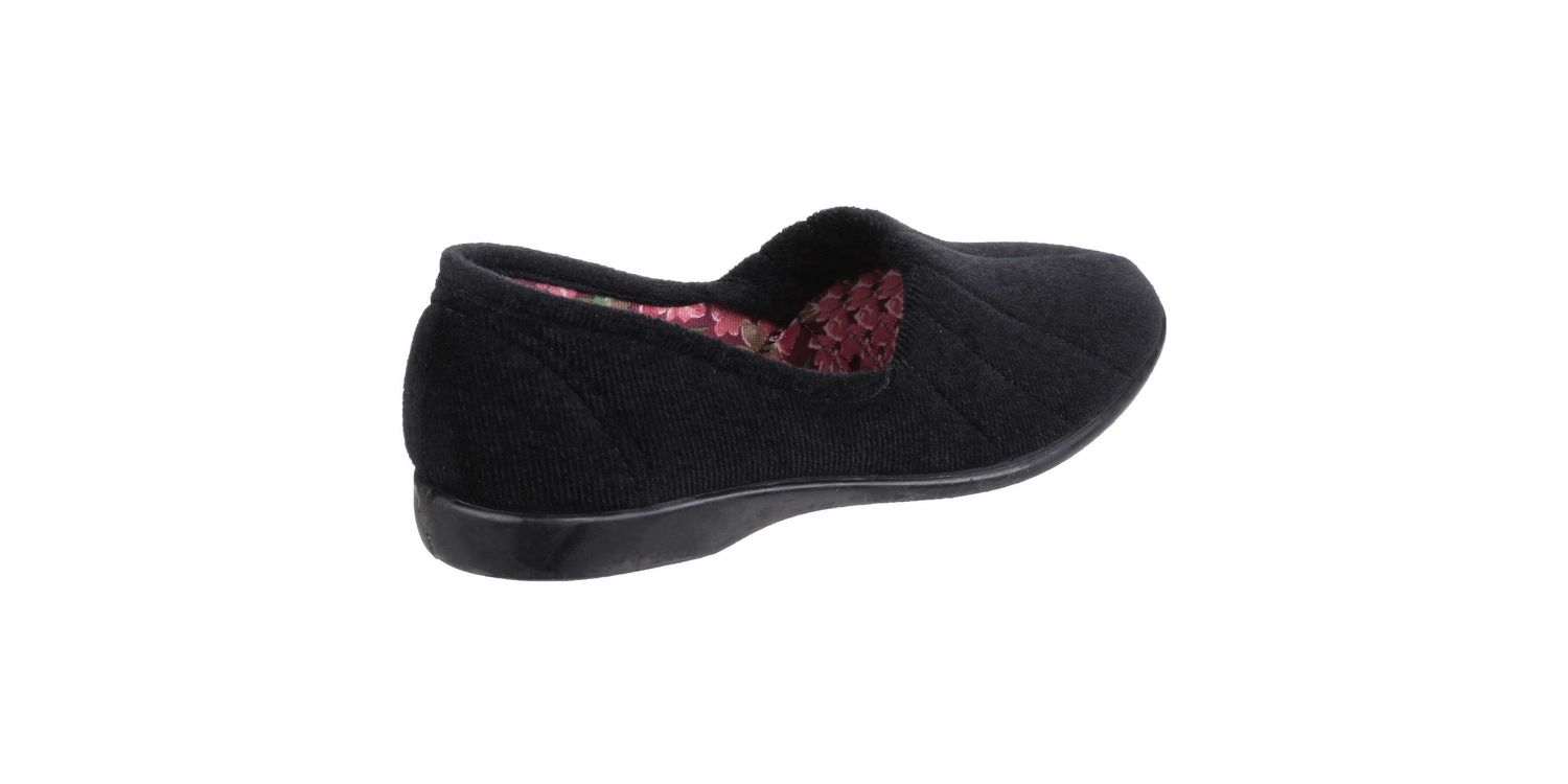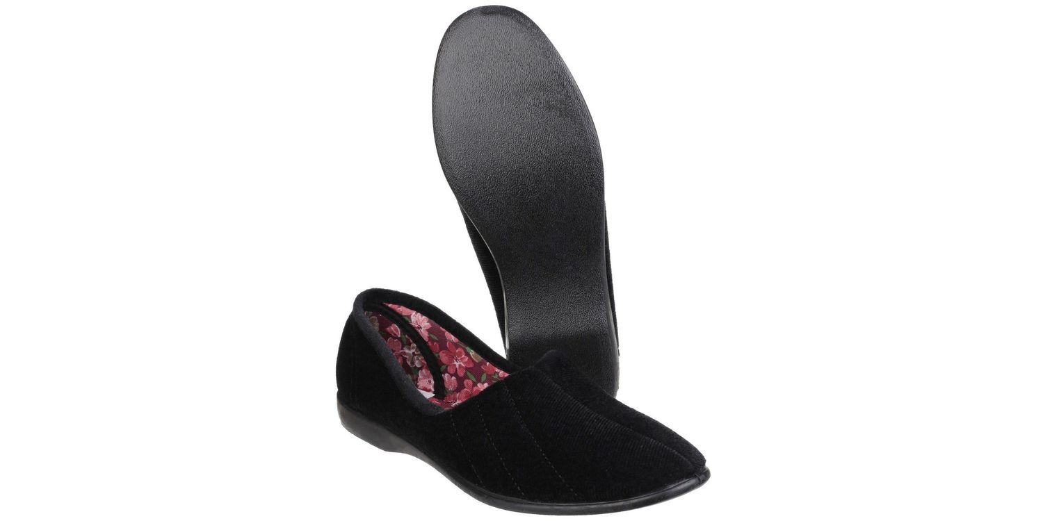 Slip into a comfortable pair of Audrey slippers from GBS. Features a decorative floral cotton lining. The stretch velour upper offers superb fit. Cushioned insole for high comfort and fit. Non-marking vulcanised rubber sole. Slip into a comfortable pair of Audrey Slippers. Features a decorative floral cotton lining. The stretch velour upper offers a superb fit. Cushioned insole for high comfort and fit. Non-marking vulcanised rubber sole.Traditional style suitable for use as an indoor shoe / slipper... . . Textile/Rubber. .