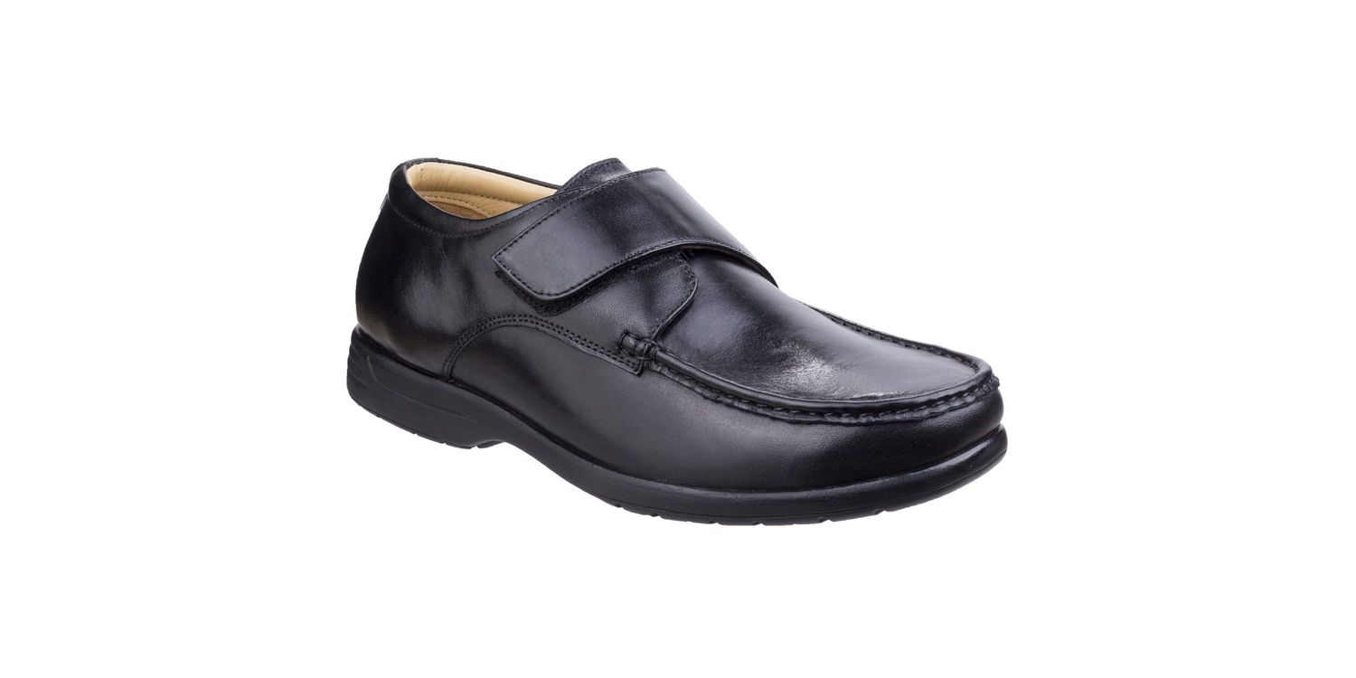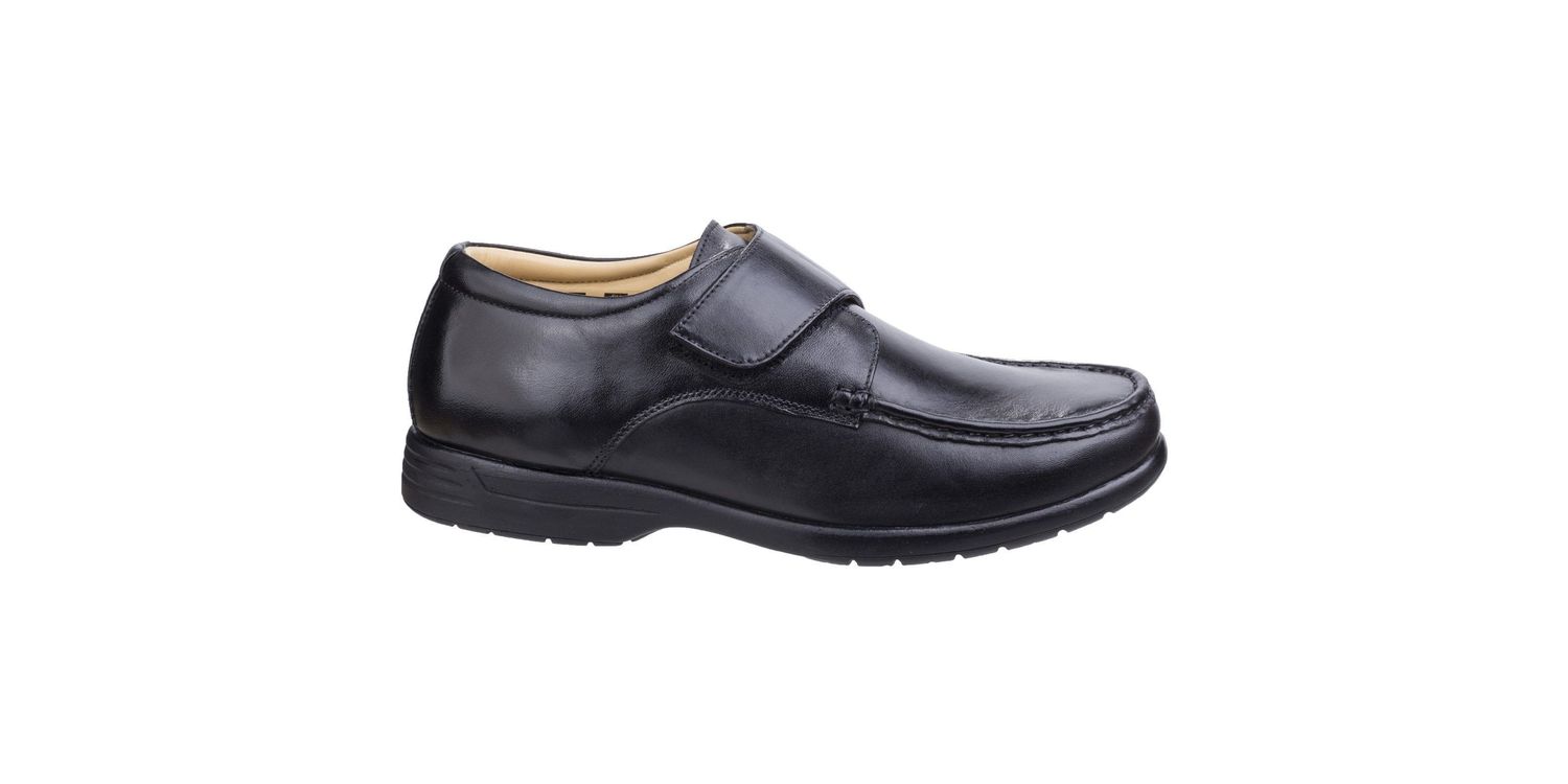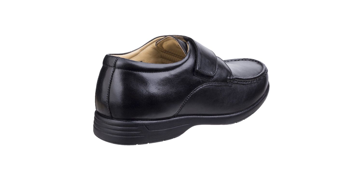 Men's moccasin shoe with dual fitting in the footwell. An option to remove the foam padded footbeds allows for a personalised fit between left and right feet for individual comfort.. Timeless style and comfort is found in this leather shoe from Fleet & Foster. Easy to slip into design with adjustable touch fastening strap. Moccasin design with wide and roomy toe box area. Dual fitting is offered in the footwell. Removable insole allows for individual fitting between left and right feet.Comfortably padded soft foam footbed.Cushion filled comfort collar.Shock absorbing heel with air release system. Comfortable and flexible lightweight sole unit. Leather/Leather/Other. Dual Fitting.