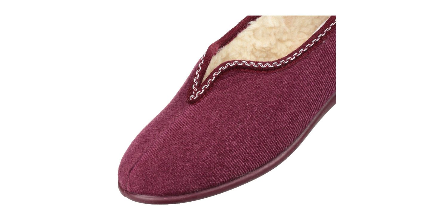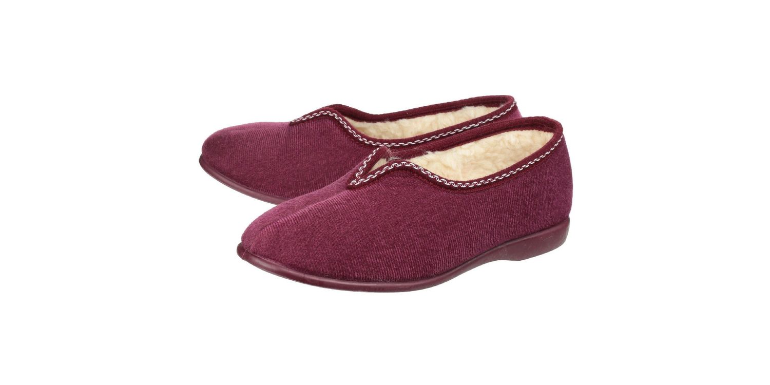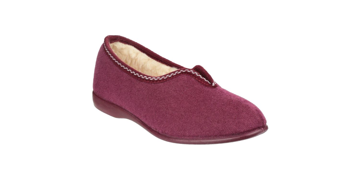 Slip into a comfortable pair of Helsinki slippers from GBS. Snug to put on with cosy faux fur warm-lining and footbed. Stretch velour upper with v-collar offers superb fit. Non-marking vulcanised rubber sole. Textile Ladies Slip-On Slipper. Warm Lined. Stitching Accents. . .... . . Textile/Textile/Rubber. .