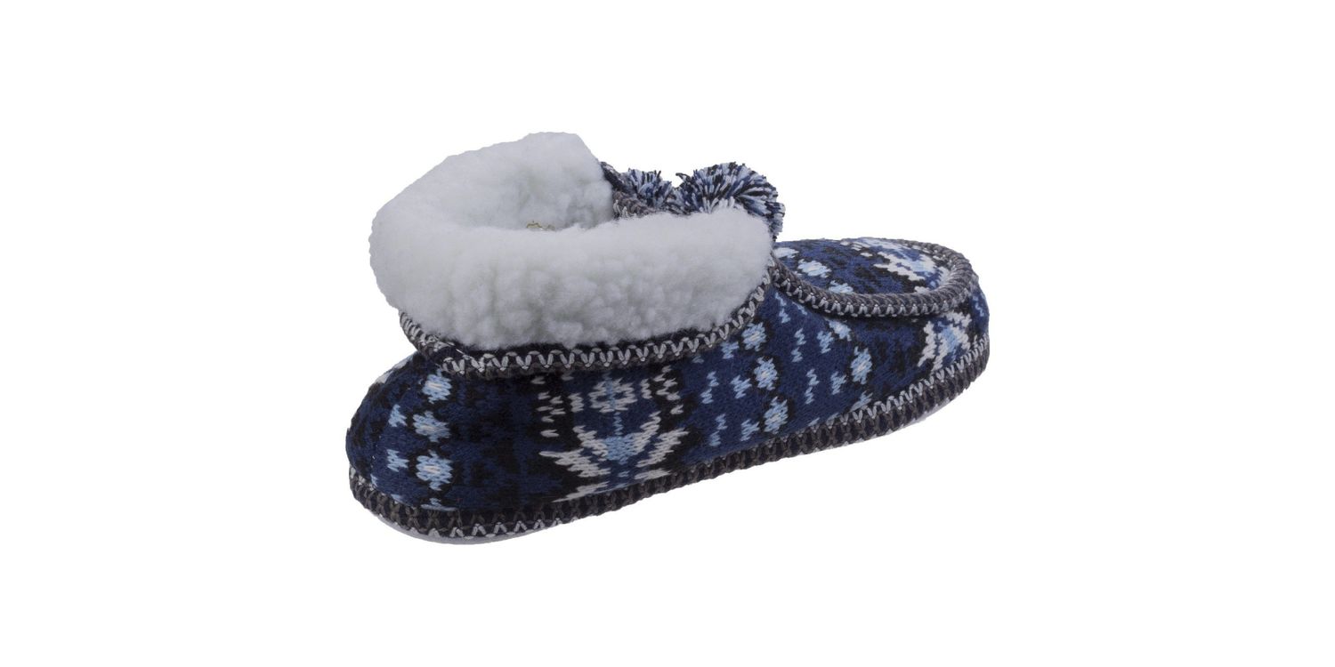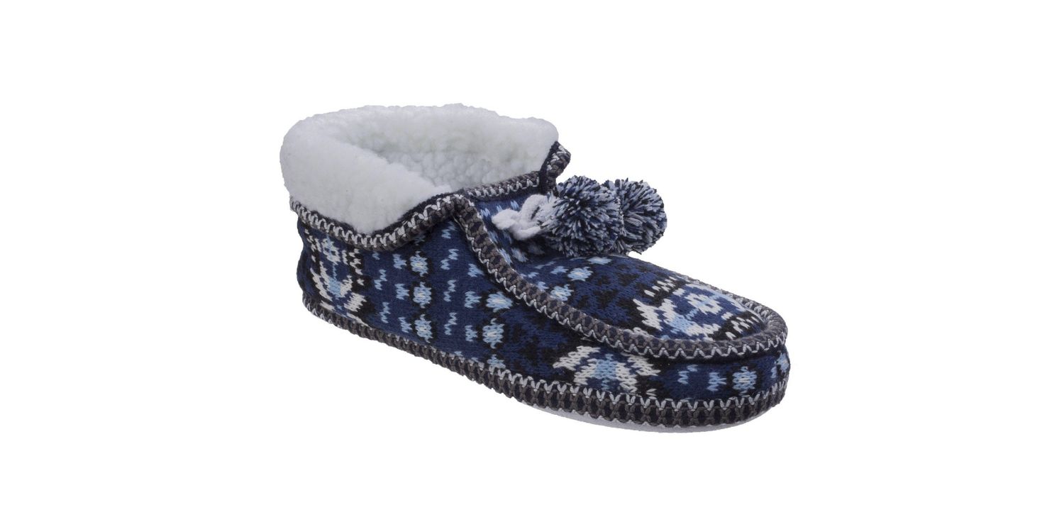 Fun knitted slipper with moccasin inspired front and delightful pom pom tassels. Soft faux sheering lining keeps you comfortable with or without socks!. Crafted with a luxury knitted upper. Funky moccasin stitched front with statement stitching. Fun pom pom tassels with knitted cord bow. Soft touch faux sheering lining and cuff. Soft foam midsole for additional cushioning.Soft and flexible TPR sole... soft TPR sole. firm stitches. Knit/polyester sherpa/TPR. .