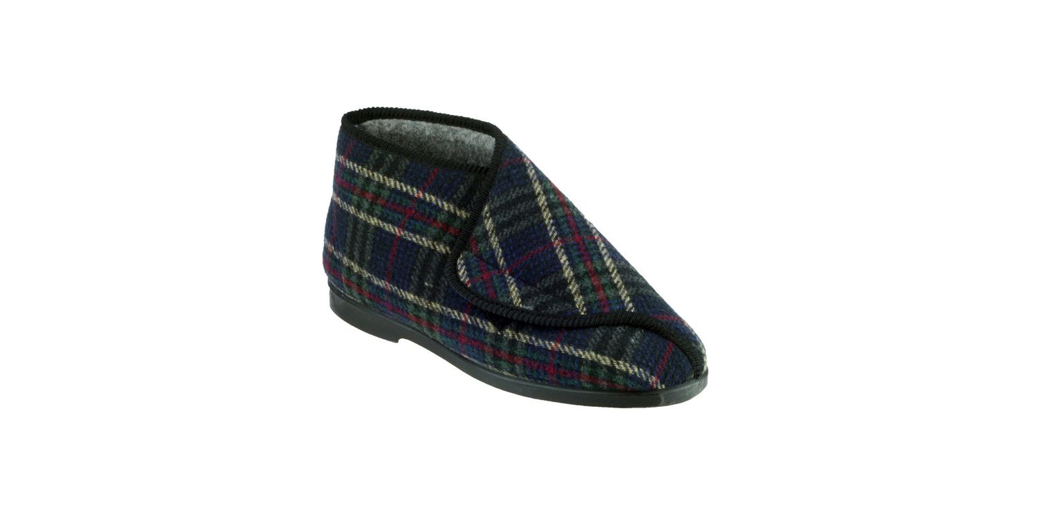 Super cosy easy touch-fasten mens slipper bootees from Great British Slippers. The classic tartan print uppers open almost down to the toe for easy entry and simply touch fasten. An adjustable design to accommodate for swelling.. Mens Touch Fastening Bootee. . . . .... . . Textile/Rubber. .