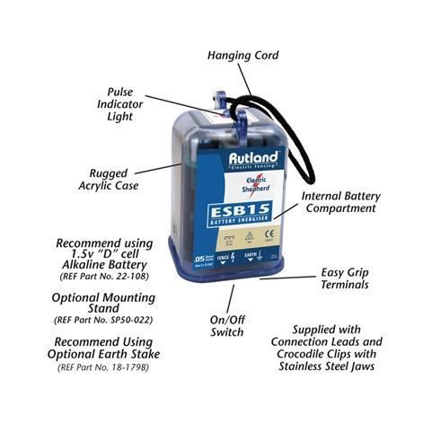 The Rutland ESB15 Battery Fence Energiser is made for paddocks and short length fences where foliage contact isn't likely. Comes with hanging cord, connection leads and crocodile clips with stainless steel jaws.