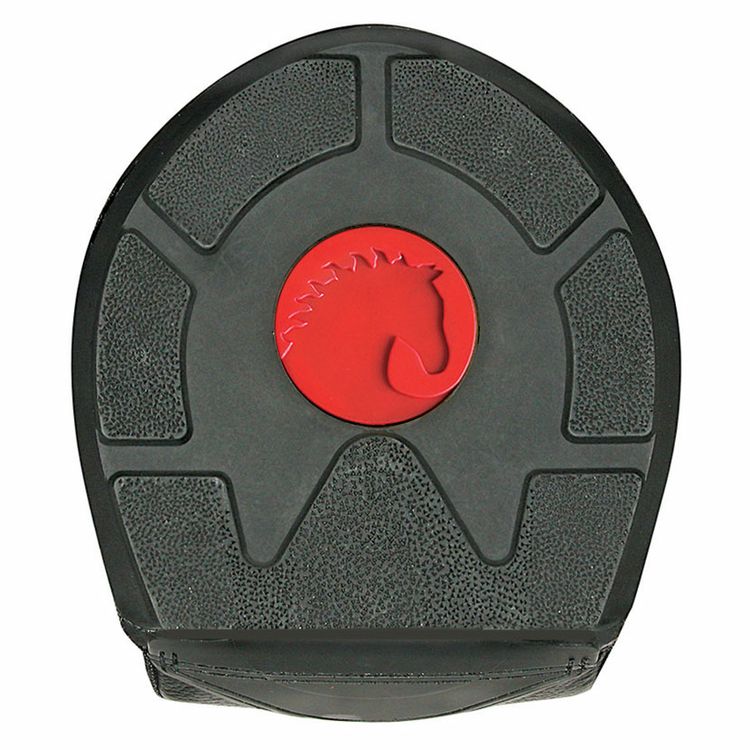 Simple to put on and remove, stays securely on hoof. Durable construction: rust proof metal waterproof thread and high performance TPU outsole. Absorbs shock and concussion. Suitable for all terrain. Built-in drainage. Fits left or right hoof. Is lightweight with a built-in sole relief to take the pressure off sole bars and frog. Moulded-in TPU back flap for maximum bulb protection. Sold in singles.