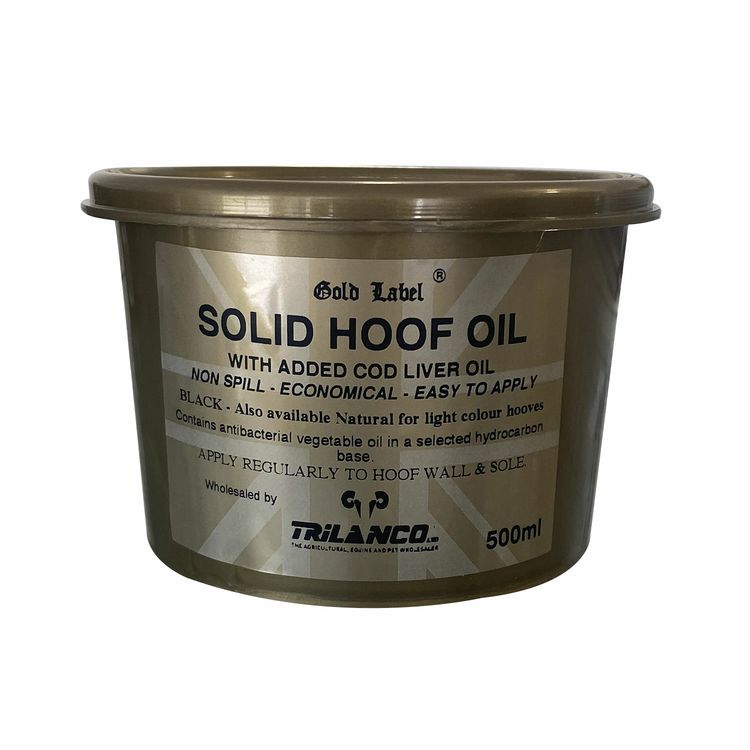 The Gold Label Solid Black Hoof Oil is a revolutionary solidified oil designed to provide optimal hoof care for your horses. This unique formulation combines the convenience of easy spreading, the economic benefits of non-spillability, and the added advantages of antibacterial vegetable oil and cod liver oil.