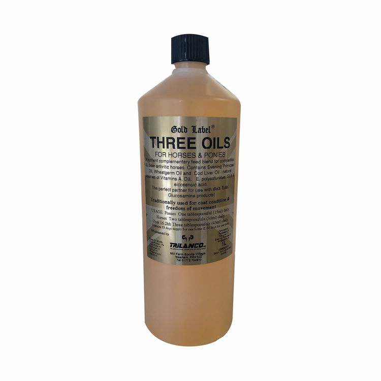 Gold Label Three Oils For Horses & Ponies is a scientifically balanced nutrient blend featuring three important natural oils; cod liver oil, evening primrose oil, and wheat germ oil. This premium quality supplement is high in vitamins A, D3, and E, making it the perfect addition to any horse or pony's diet. Designed for feeding to show stock and older animals to support healthy joints, this supplement helps to maintain circulation, skin condition, and joint mobility.