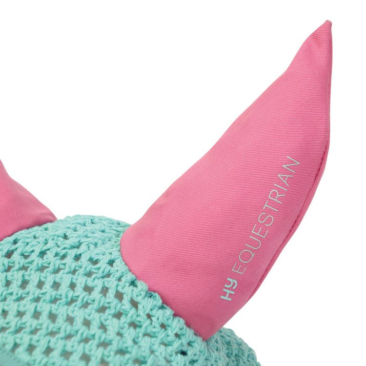 Keep your eyes on the prize with this Thelwell Trophy print Fly Veil! This mint, close-knit crochet fly veil complete with contrasting pink cord detail, breathable ears and the Thelwell trophy and rosette pattern on the front is a must have accessory. This fly veil matches perfectly with the Thelwell range, including saddle pad.