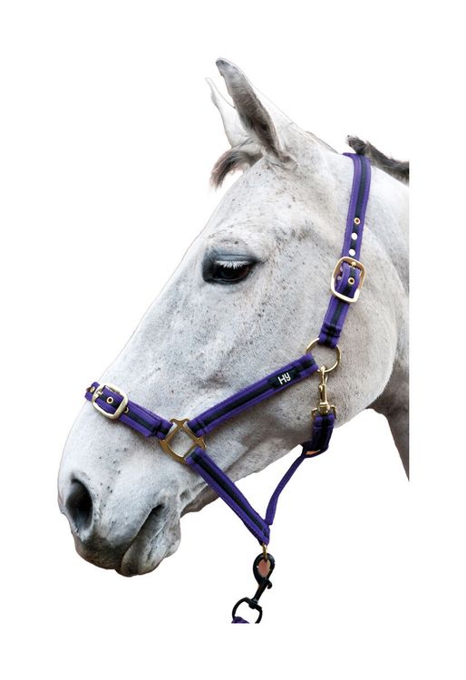 This very comfortable soft webbing headcollar is stylish yet strong. Adjustable brass fittings with trigger hook.