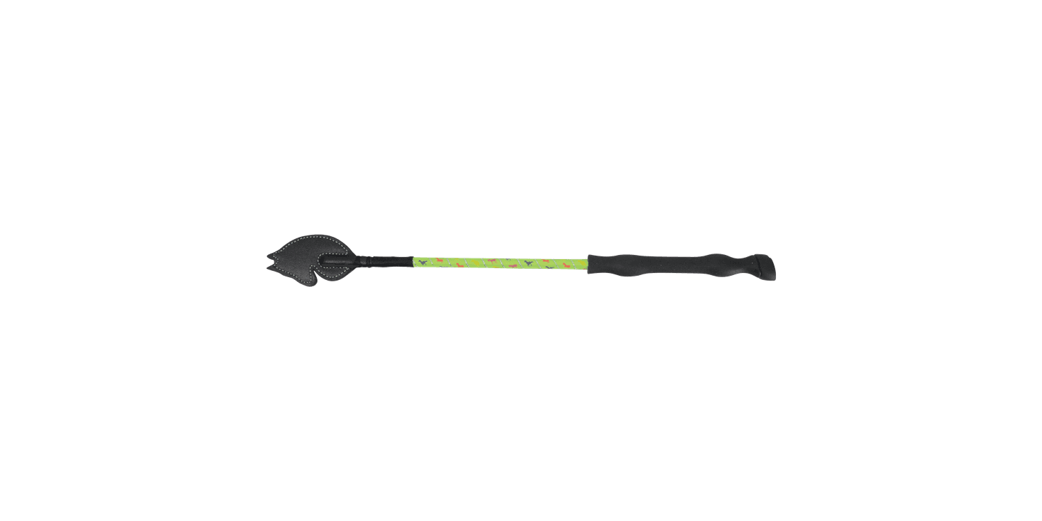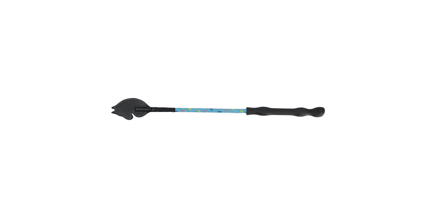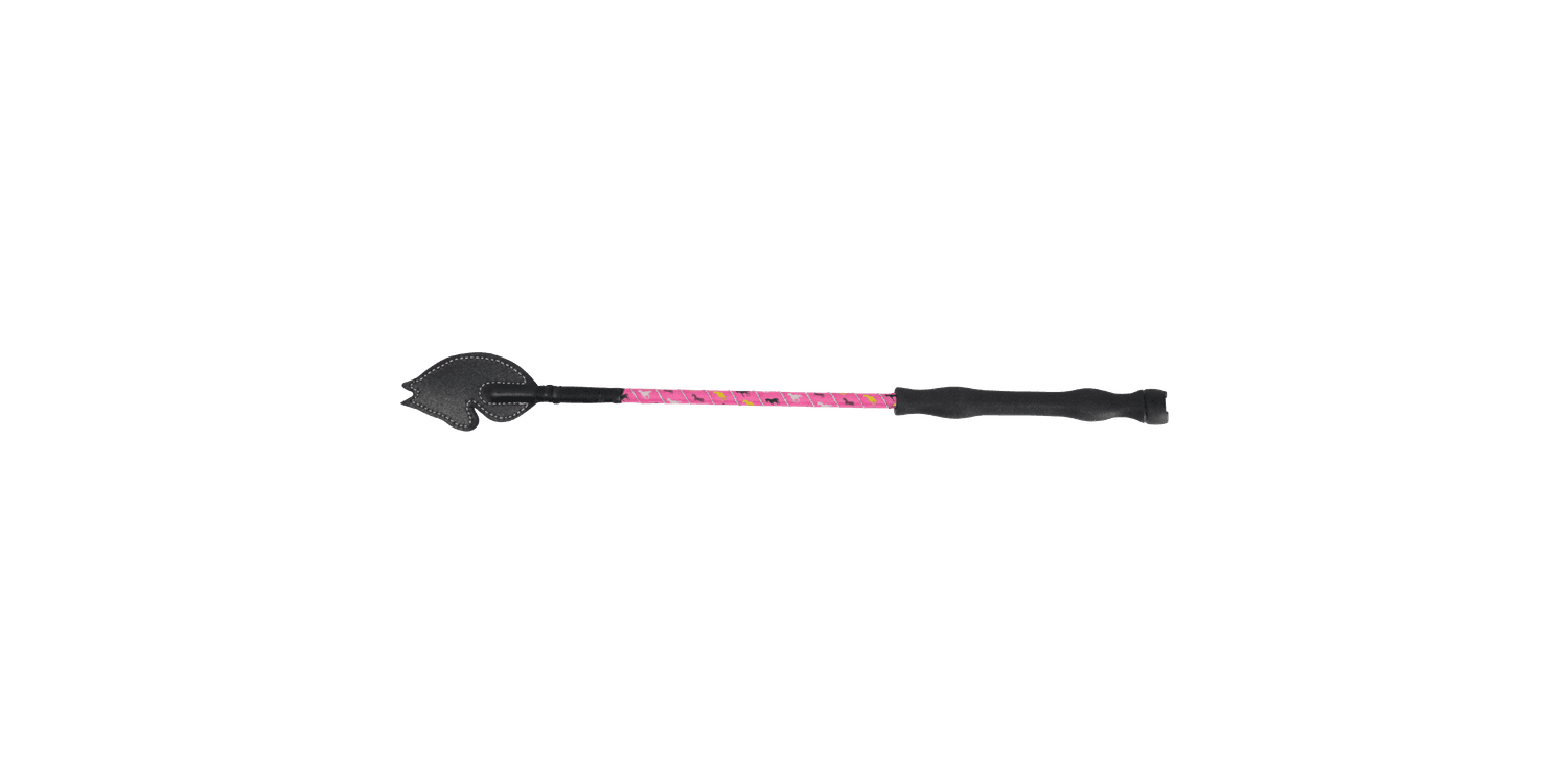 This horse head whip is perfect for everyday riding. The horse print design runs against the base colour broken up by a silver glitter wrap on the body of the whip. The ergonomically designed handle improves grip and comfort on this scaled-down whip perfect for smaller hands.