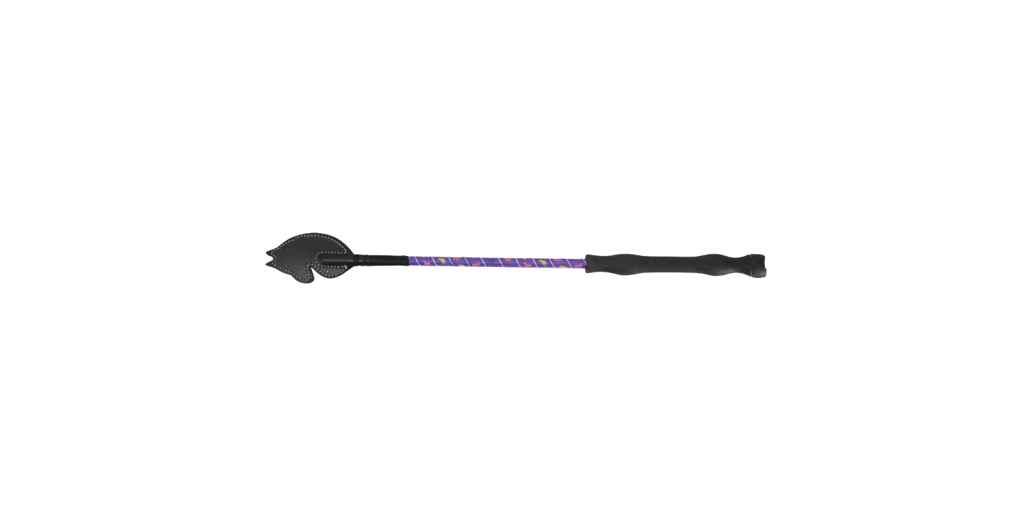 This horse head whip is perfect for everyday riding. The horse print design runs against the base colour broken up by a silver glitter wrap on the body of the whip. The ergonomically designed handle improves grip and comfort on this scaled-down whip perfect for smaller hands.