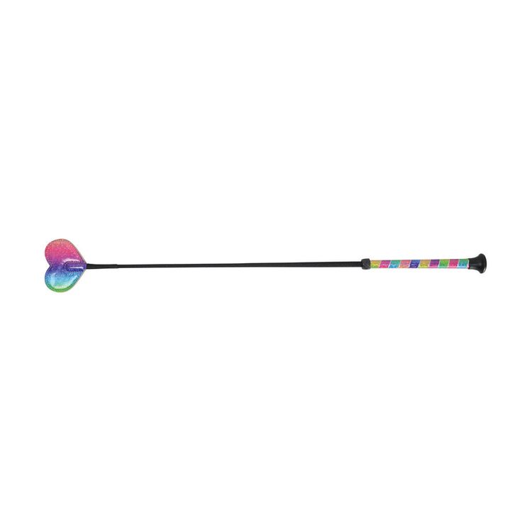 This fun whip will add colour to the darkest day! Glittery rainbow colours flow into one another on the heart shaped end whilst the matching handle is broken up by a silver glitter wrap. Perfect for children!