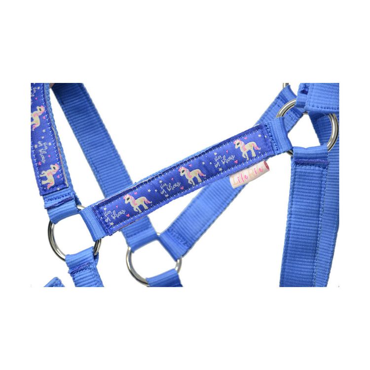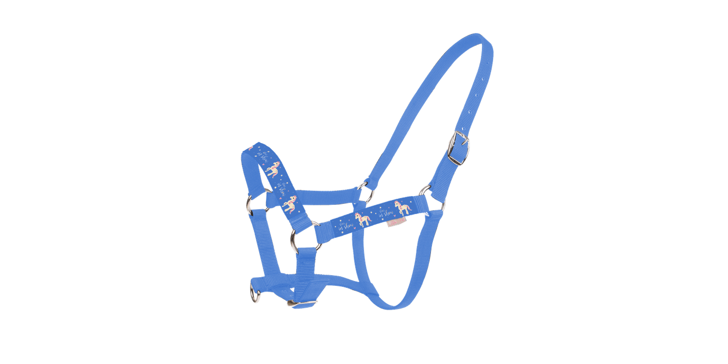 This head collar is ideal for everyday use or for those special occasions with your pony. This durable headcollar features a soft lead rope and a cute pony pattern to the nose and cheek pieces. Really complete your Little Rider look with this set.