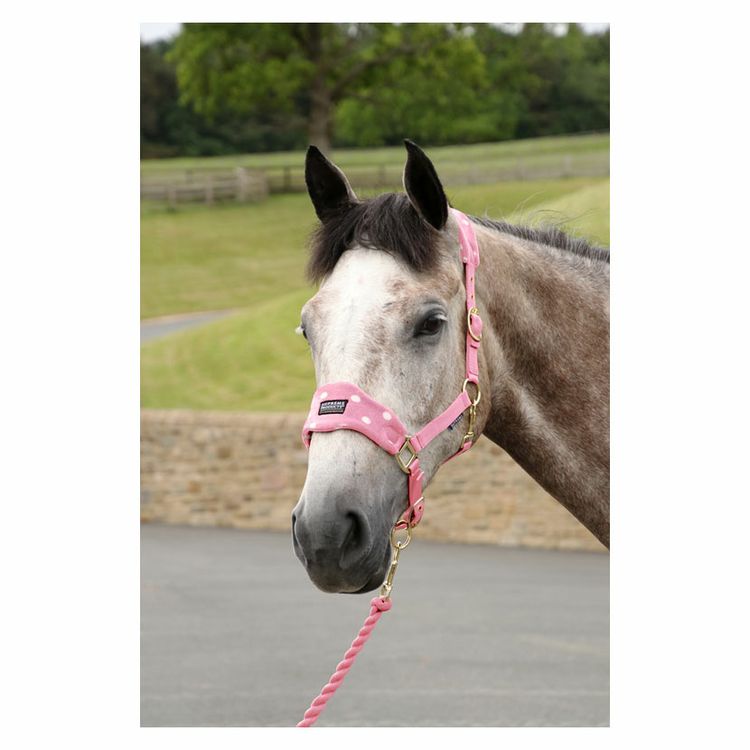 A super smart head collar and lead rope set with luxurious fleece over the poll and nose making it ideal for sensitive horses susceptible to rubbing. Various gold hardwear fastenings allow for quick adjustments and easy removal, perfect for when travelling to competitions and worn over a bridle. Create the perfect matchy matchy look when teamed with the rest of the Dotty Fleece Collection. Available in Rosette Red and Pretty Pink.