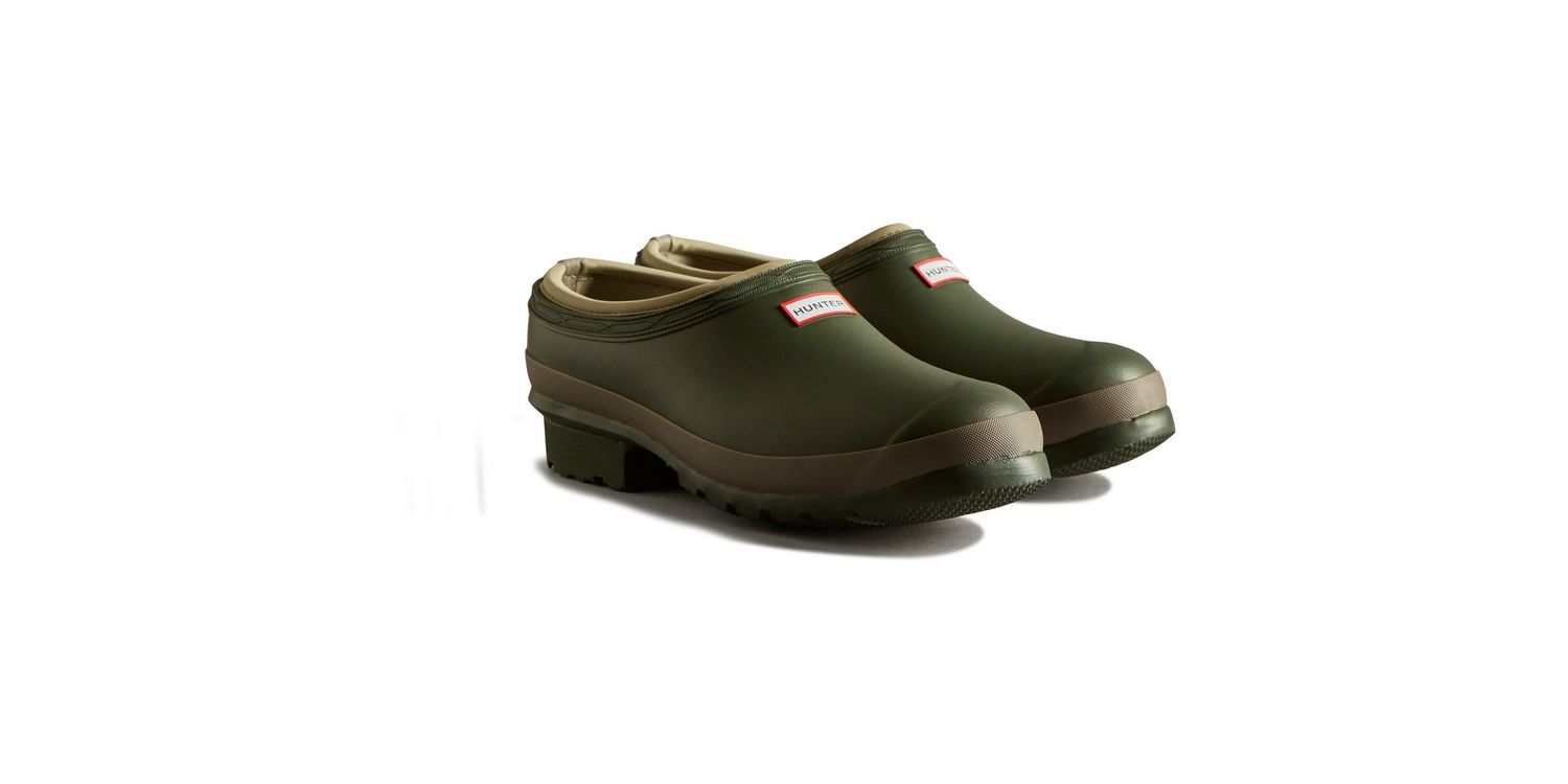 The Hunter Boot Co Green Gardener Clogs are a stylish and functional take on gardening footwear. These slip-on clogs are made of Waterproof Vegan Rubber and feature the iconic red box logo in a dark green hue. The flexible natural rubber design combines comfort and versatility, with Hunter's signature tread for optimal grip and a neoprene lining for a comfortable fit. Hunter's commitment to sustainable design is highlighted by the recycled insole, making these clogs an ideal gardening companion.