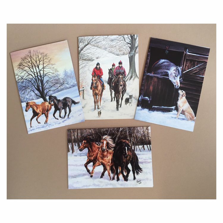 Pack of festive equestrian cards, all individually wrapped and barcoded. No message inside. Published and printed in the UK. Size: 195mm x 140mm. Designs may vary.