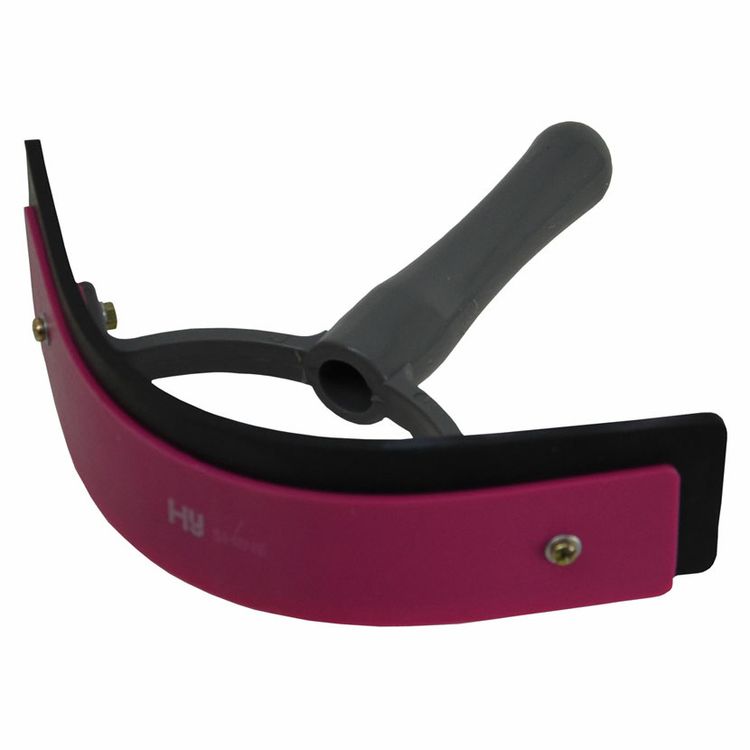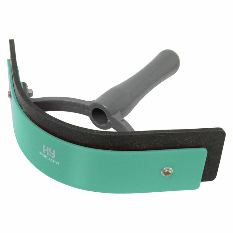 Two tone, soft touch sweat scraper with a rubber edge on one side to remove excess water from the horse's coat.