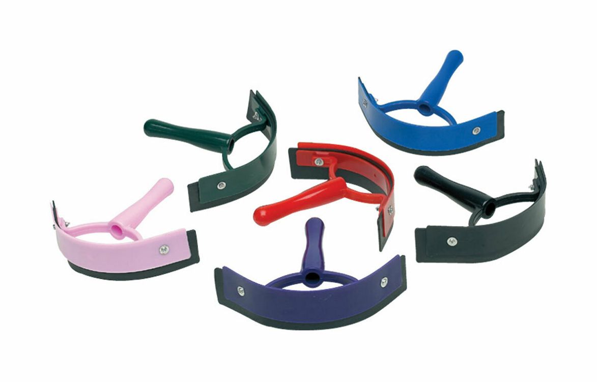 Plastic kite frame with a rubber edge to remove excess water from the horse's coat.